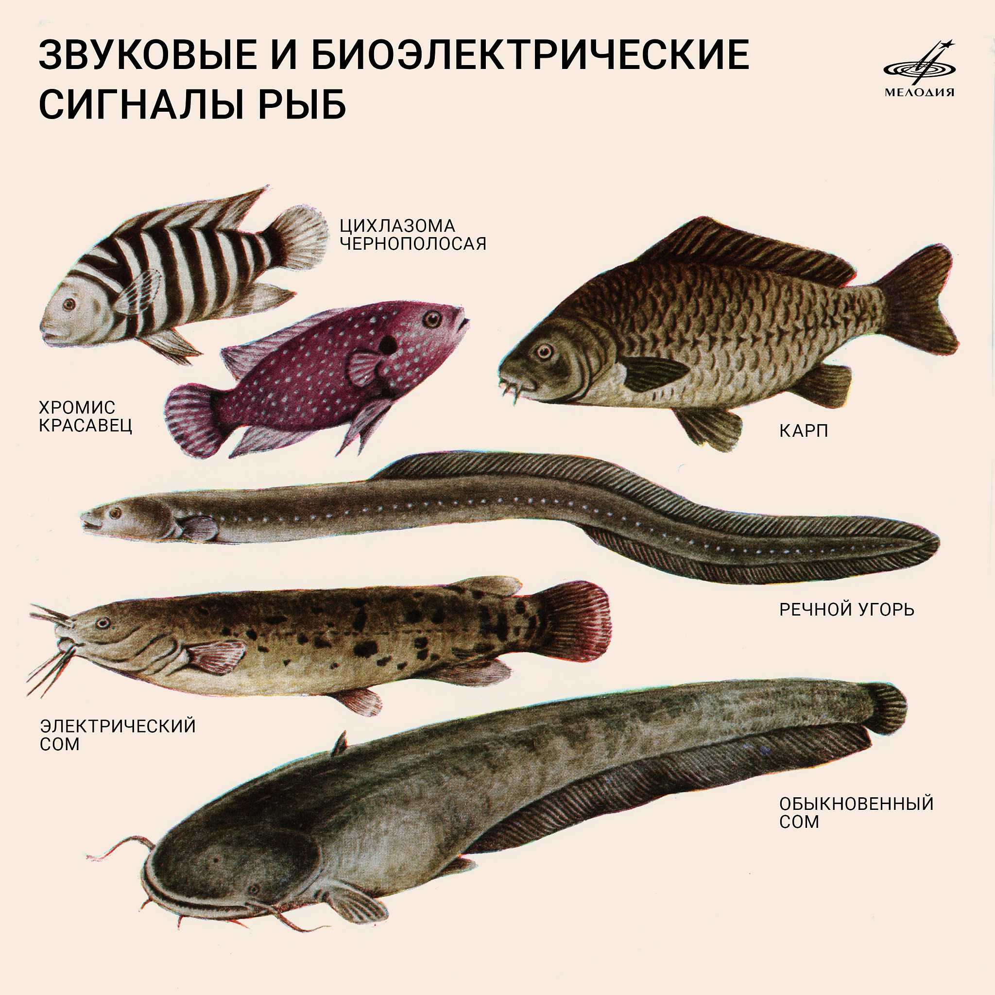 Особое место в общении и ориентации рыб принадлежит биоэлектричеству. Накопление большого заряда сильноэлектрическими рыбами связано со взаимоотношениями хищник — жертва (треки 9–11). Это было давно известно натуралистам. К настоящему времени обнаружено, что около 300 видов рыб способны воспроизводить электрическое поле и использовать его в целях ориентации и общения (трек 12). В последние годы неожиданно выяснилось, что электрические разряды могут излучать обычные рыбы, не имеющие специальных производящих электричество органов (треки 13, 14). Биологическое значение слабых разрядов у неэлектрических рыб в настоящее время выясняется.