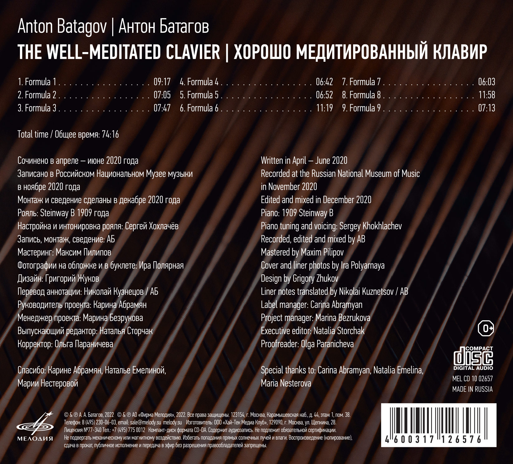 С фирмой «Мелодия» Батагов сотрудничает с 2016 года, регулярно выпуская новые альбомы. Коллекция его дисков, которые выпустил наш звукозаписывающий лейбл, включает как интерпретации классических сочинений (Баха, Моцарта, Дебюсси, Шуберта, Шопена, английской музыки XVI–XVII веков), так и авторские сочинения. Предлагаемая фонограмма датируется ноябрем 2022 года.