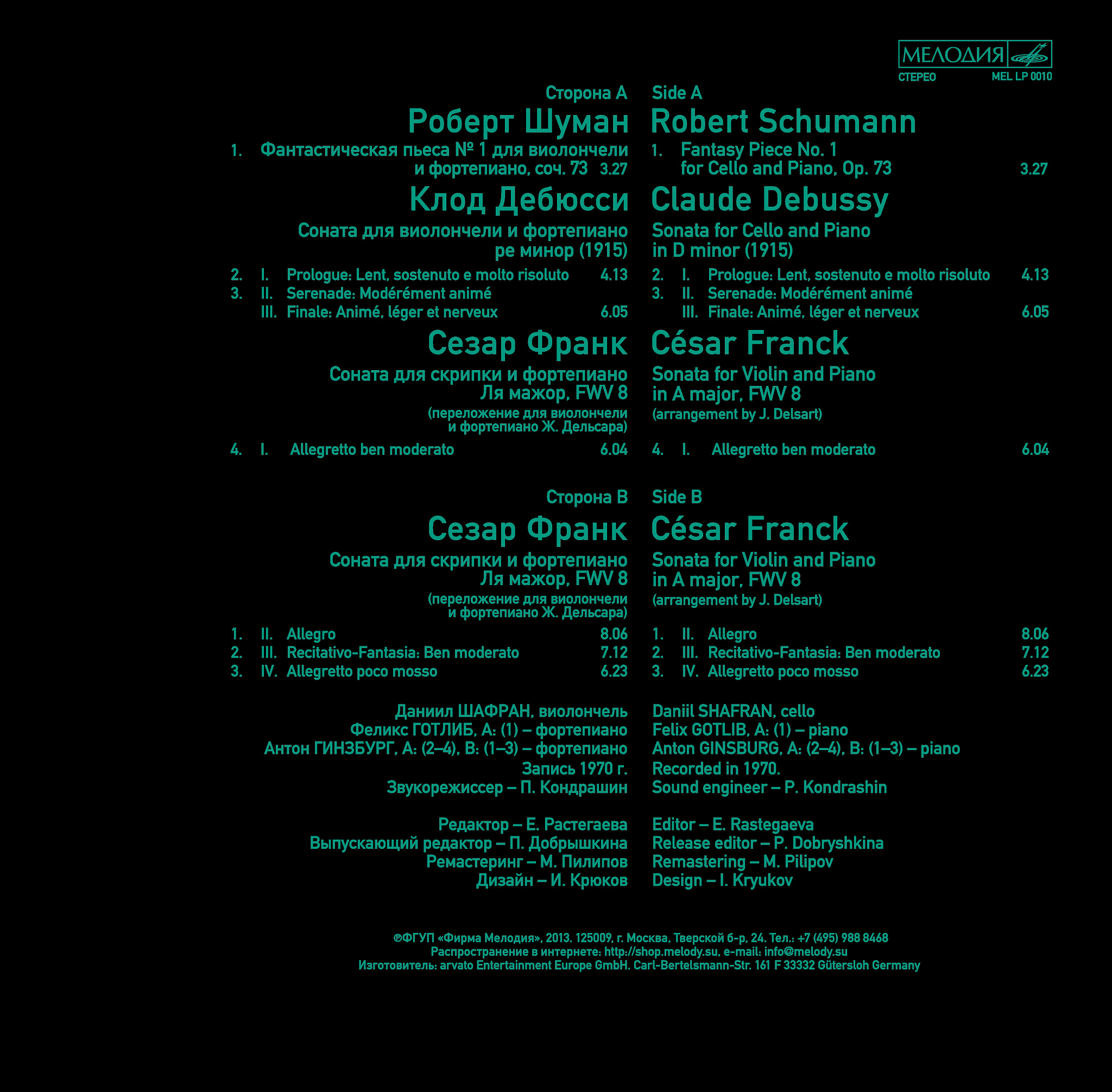 В исполнении Даниила Шафрана звучат произведения Роберта Шумана, Клода Дебюсси и Сезара Франка. Записи были осуществлены в 1970 г.