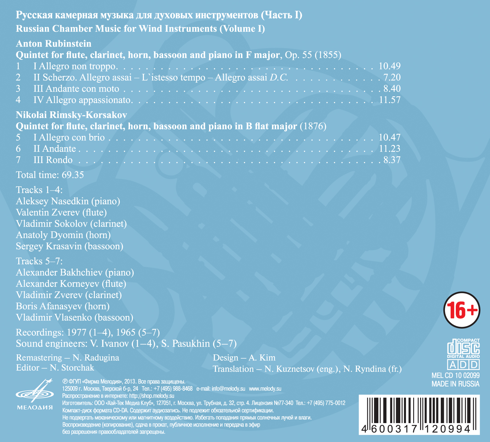 Камерные ансамбли Римского-Корсакова и Рубинштейна звучат в исполнении выдающихся представителей русской исполнительской школы ХХ в.: Алексея Наседкина и Александра Бахчиева (фортепиано), Валентина Зверева и Александра Корнеева (флейта), Владимира Соколова и Владимира Зверева (кларнет), Анатолия Демина и Бориса Афанасьева (валторна), Сергея Красавина и Владимира Власенко (фагот).