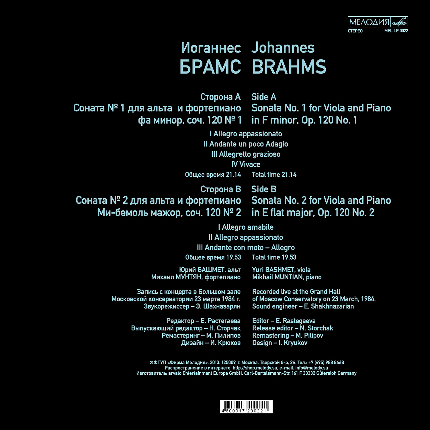 Фирма «Мелодия» предлагает Вашему вниманию камерную музыку Брамса в исполнении Юрия Башмета и Михаила Мунтяна.