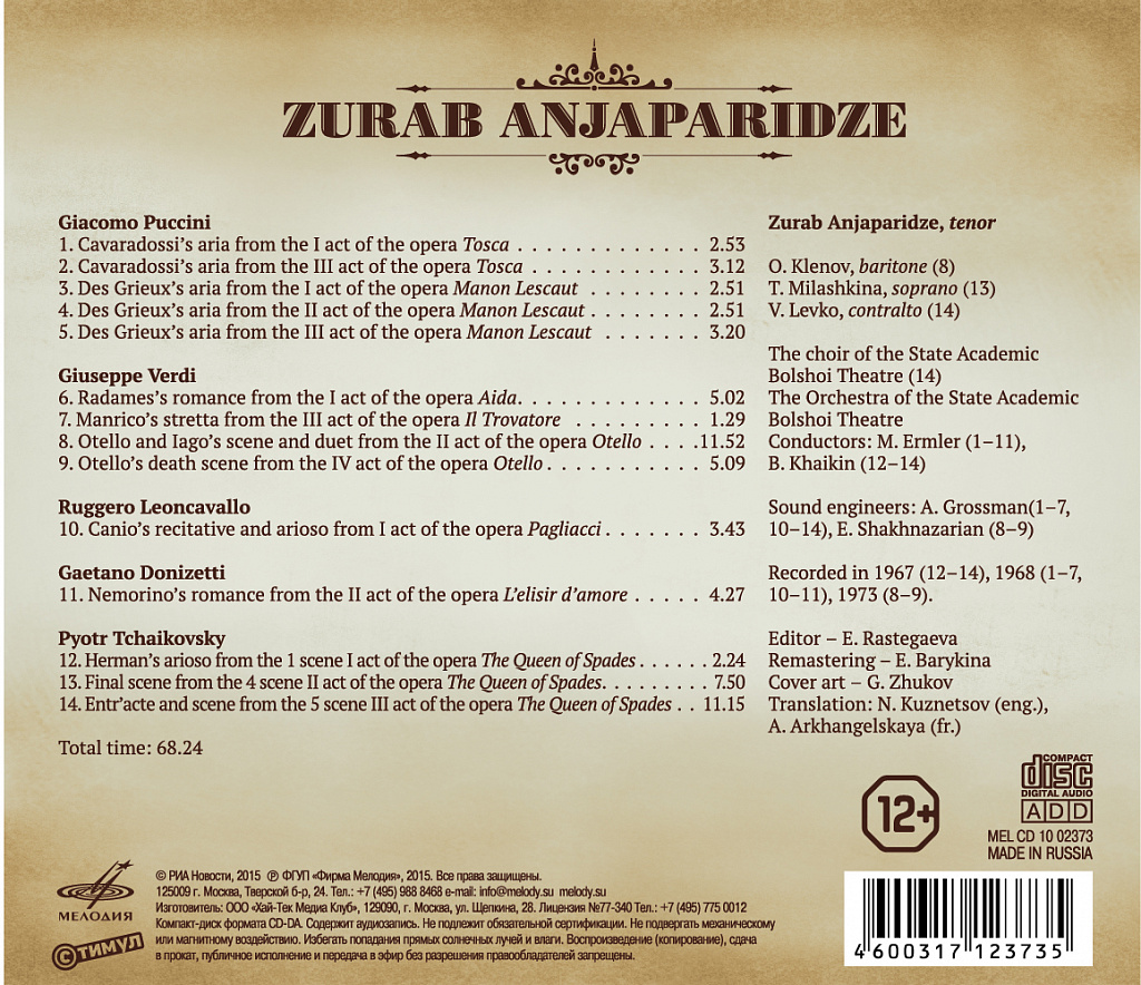 В исполнении Зураба Анджапаридзе звучат фрагменты из опер «Пиковая дама», «Кармен», «Аида», а также «Трубадур» и «Отелло» Верди, «Тоска» и «Манон Леско» Пуччини, «Любовный напиток» Доницетти, «Паяцы» Леонкавалло. Записи были осуществлены в 1960-1970-е гг. с оркестром Большого театра СССР под управлением А. Мелик-Пашаева, Б. Хайкина и М. Эрмлера.