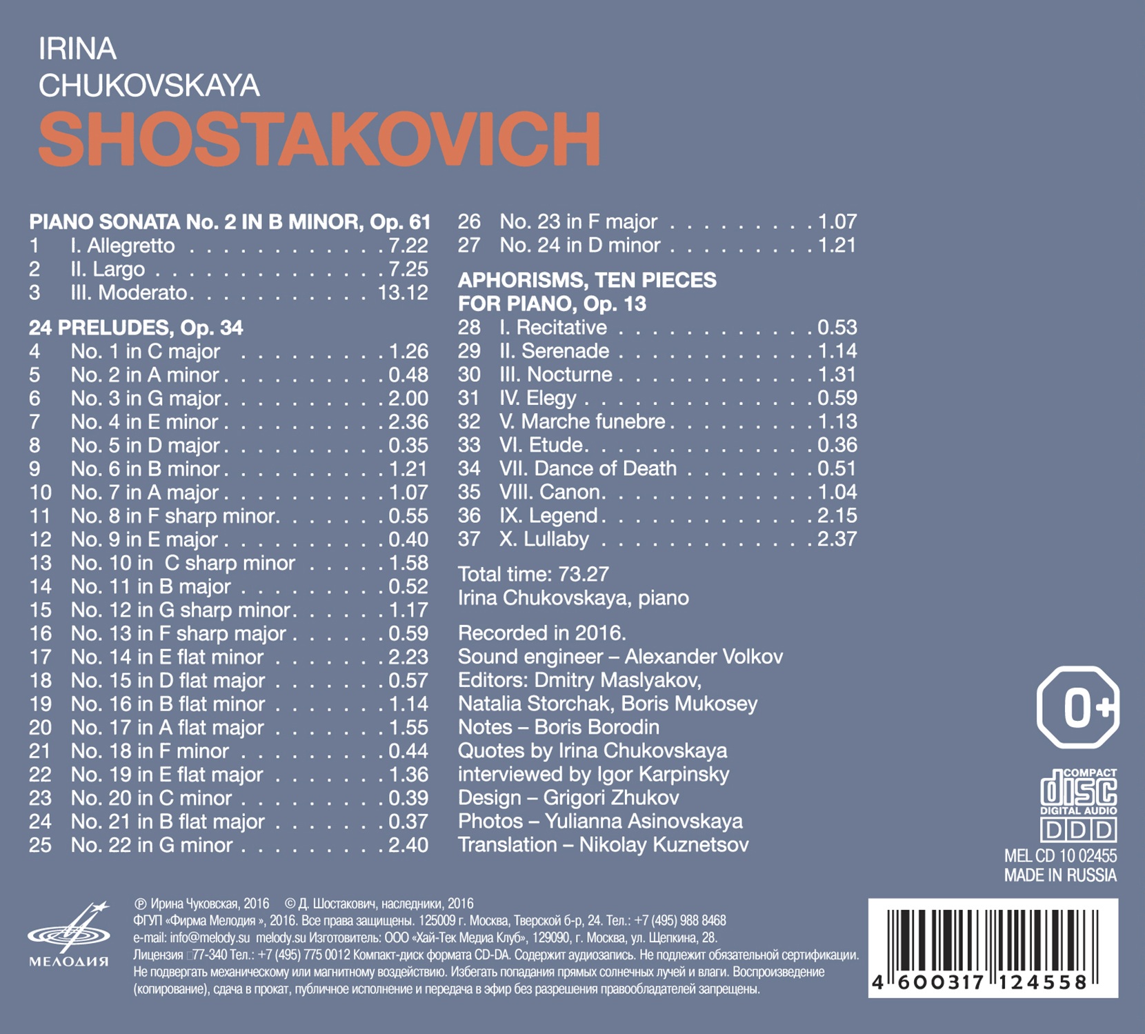 Фирма «Мелодия» предлагает вашему вниманию новый диск известной российской пианистки Ирины Чуковской (Петровой), посвященный 110-летнему юбилею классика музыки ХХ века Д.Д. Шостаковича. «Ирина Чуковская – ярко одаренная пианистка. Ее игра привлекает незаурядной виртуозностью, звуковой культурой и подлинным артистизмом. Ей подвластна музыка различных стилей и направлений», – так охарактеризовал искусство пианистки Мстислав Леопольдович Ростропович. Выпускница ЦМШ и Московской консерватории, ученица В. Горностаевой и С. Нейгауза, победитель Международного конкурса имени Ф. Шопена в Варшаве (1980), Ирина Чуковская сегодня является профессором Российской академии музыки им. Гнесиных и относится к лучшим представителям нейгаузовской школы в современном музыкально-исполнительском искусстве и фортепианной педагогике. Концерты пианистки проходят на крупнейших концертных площадках России, Европы и Азии; особой известностью Ирина Чуковская пользуется в США, где она дала более 500 концертов. «Чуковская сочетает потрясающую технику со страстной и поэтичной музыкальностью. Ее репертуар огромен; ее выступления часто становятся откровением», – писал американский дирижер Д. Гилберт. Много лет продолжается сотрудничество И. Чуковской с дирижером Максимом Шостаковичем. «Я неоднократно выступал с Ириной Чуковской и был свидетелем ее значительных художественных достижений, – свидетельствует музыкант. – К их числу я отношу и эту запись произведений моего отца. С покоряющей убедительностью она передает пронзительную трагедийность образов сонаты, гибкую изменчивость настроений прелюдий, парадоксальную эксцентричность афоризмов». На диске представлены наиболее значительные сочинения Д.Д. Шостаковича для фортепиано соло – ранний экспериментальный цикл «Афоризмы» (1927), известнейшие «24 прелюдии для фортепиано» (1932–33) и одно из самых масштабных творений военного периода Вторая соната для фортепиано (1943), посвященная памяти учителя Шостаковича, одного из основателей советской фортепианной школы Леонида Николаева.
