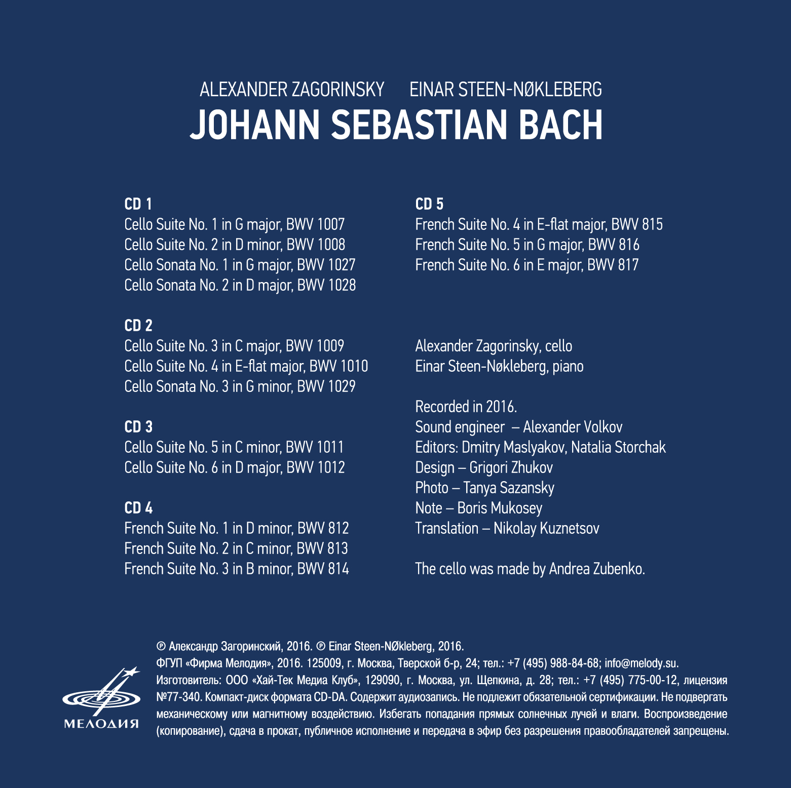 Комплект камерной музыки Иоганна Себастьяна Баха записан дуэтом Александра Загоринского (виолончель) и Эйнара Стин-Ноклеберга (фортепиано).