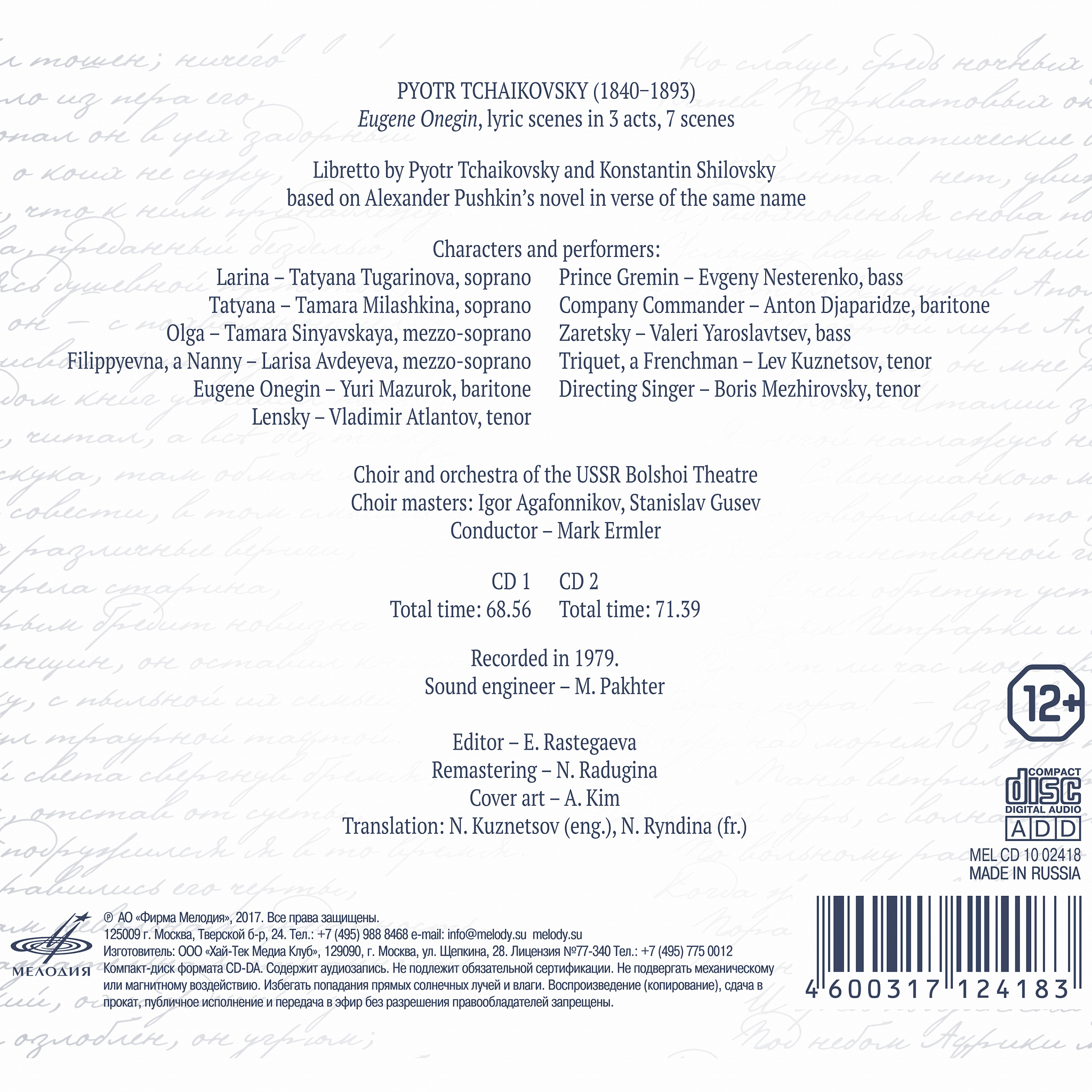 Предлагаемая запись была осуществлена коллективом Большого театра СССР в 1979 г. под руководством дирижера Марка Эрмлера — одного из крупнейших представителей российской дирижерской традиции. Заглавную партию исполняет Юрий Мазурок, чья благородная, сдержанная трактовка Онегина на два с лишним десятилетия стала «визитной карточкой» Большого театра. В роли Ленского выступает наиболее яркий тенор оперной труппы Большого второй половины века Владимир Атлантов. В записи также заняты Тамара Милашкина, Тамара Синявская и Евгений Нестеренко — представители золотого фонда русской вокальной школы.