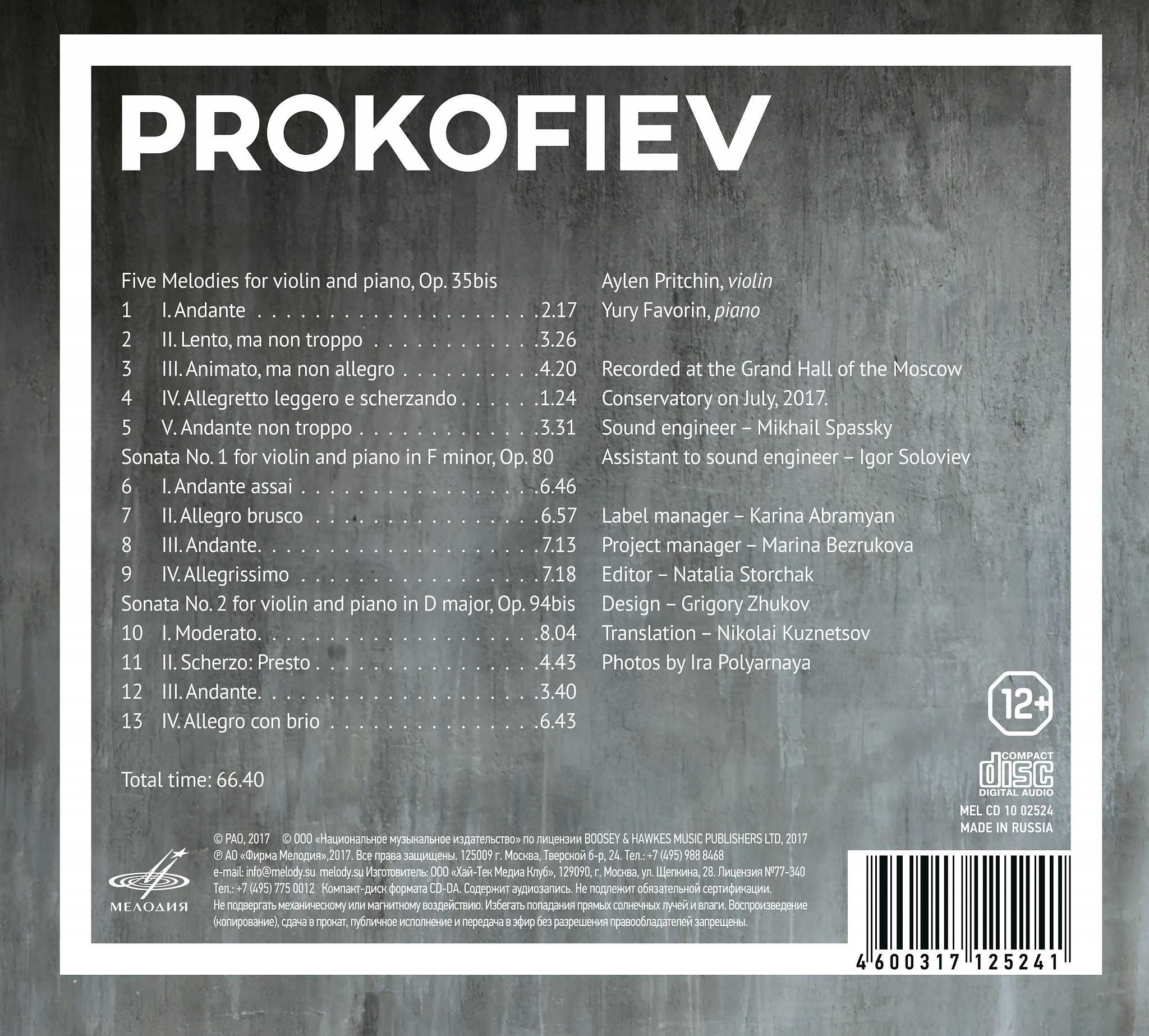 Три опуса Прокофьева для скрипки и фортепиано, написанные в разные годы, звучат как главы единого музыкально-биографического романа и, одновременно, демонстрируют разнообразие творческого облика Прокофьева. Лирический цикл «Пять мелодий» представляет собой переложение вокализов, сочиненных в 1920-е гг. для певицы Нины Кошиц. Прозрачно-светлая Соната № 2 для скрипки и фортепиано (1944) — переложение сонаты для флейты, выполненное по просьбе Давида Ойстраха. Кульминация диска — полная драматических контрастов Соната № 1 для скрипки и фортепиано (1938–1946).
