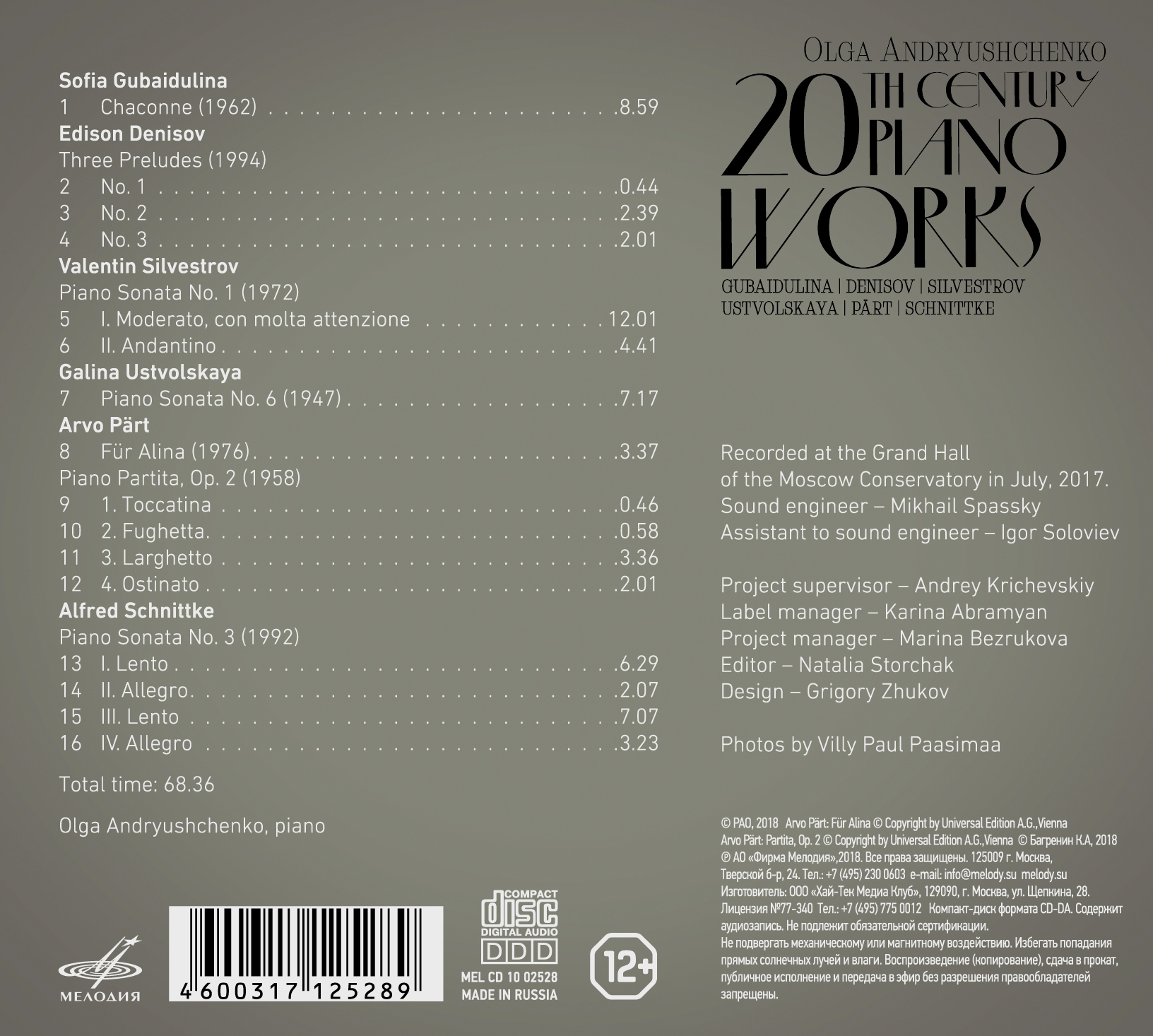 Российская пианистка, ныне живущая в Германии, Ольга Андрющенко окончила Московскую консерваторию по классу исторического и современного исполнительского искусства профессора Алексея Любимова, затем совершенствовалась в аспирантуре Высшей школы музыки в Кёльне. Особое внимание она уделяет российской музыке ХХ–XXI столетий (на счету пианистки записи полных собраний фортепианной музыки Александра Мосолова и Николая Рославца). Свой первый диск на «Мелодии» Ольга Андрющенко рассматривает как продолжение работы над музыкой отечественного послевоенного авангарда.