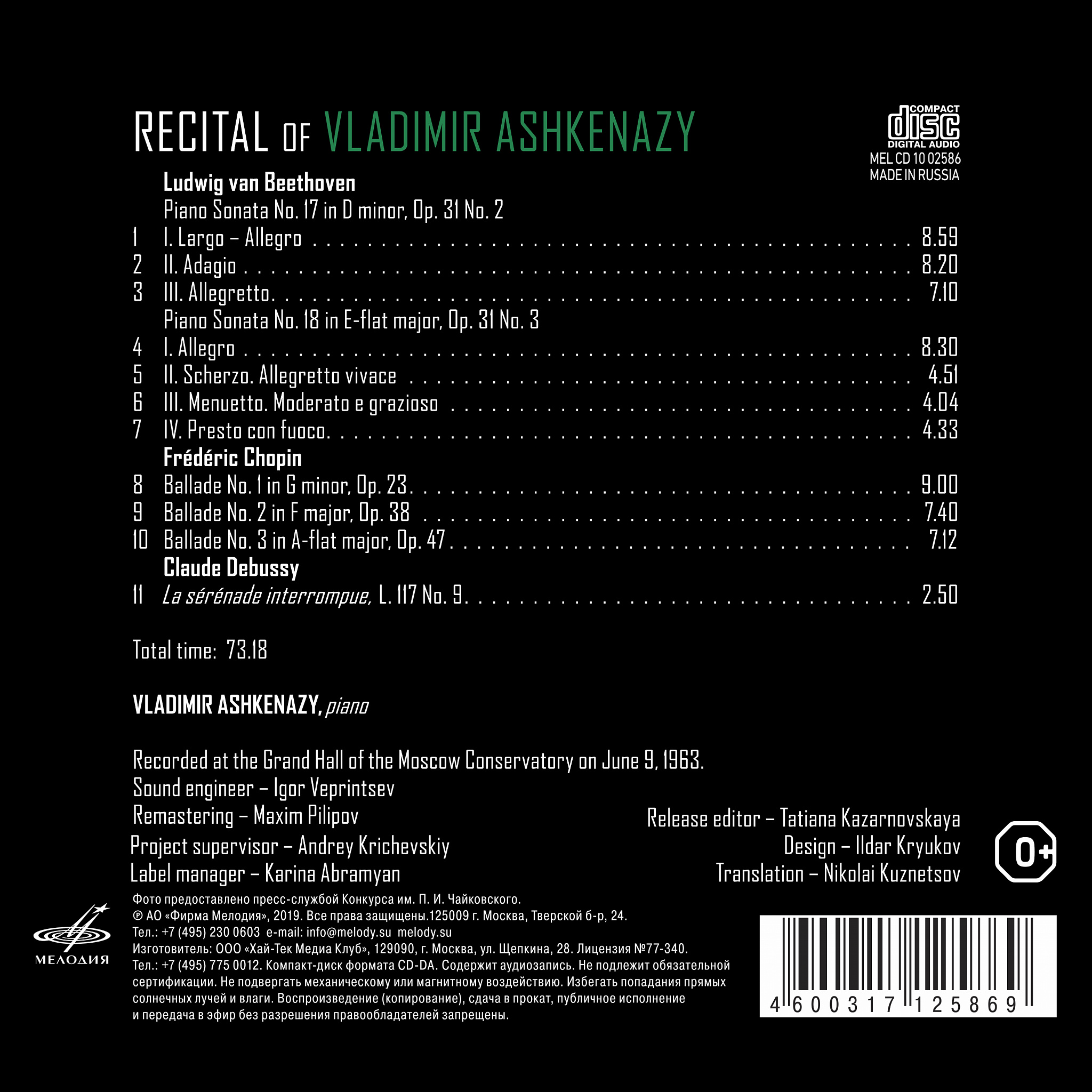 Фирма «Мелодия» предлагает вашему вниманию фонограмму концерта Владимира Ашкенази 9 июня 1963 г. в Большом зале Московской консерватории.