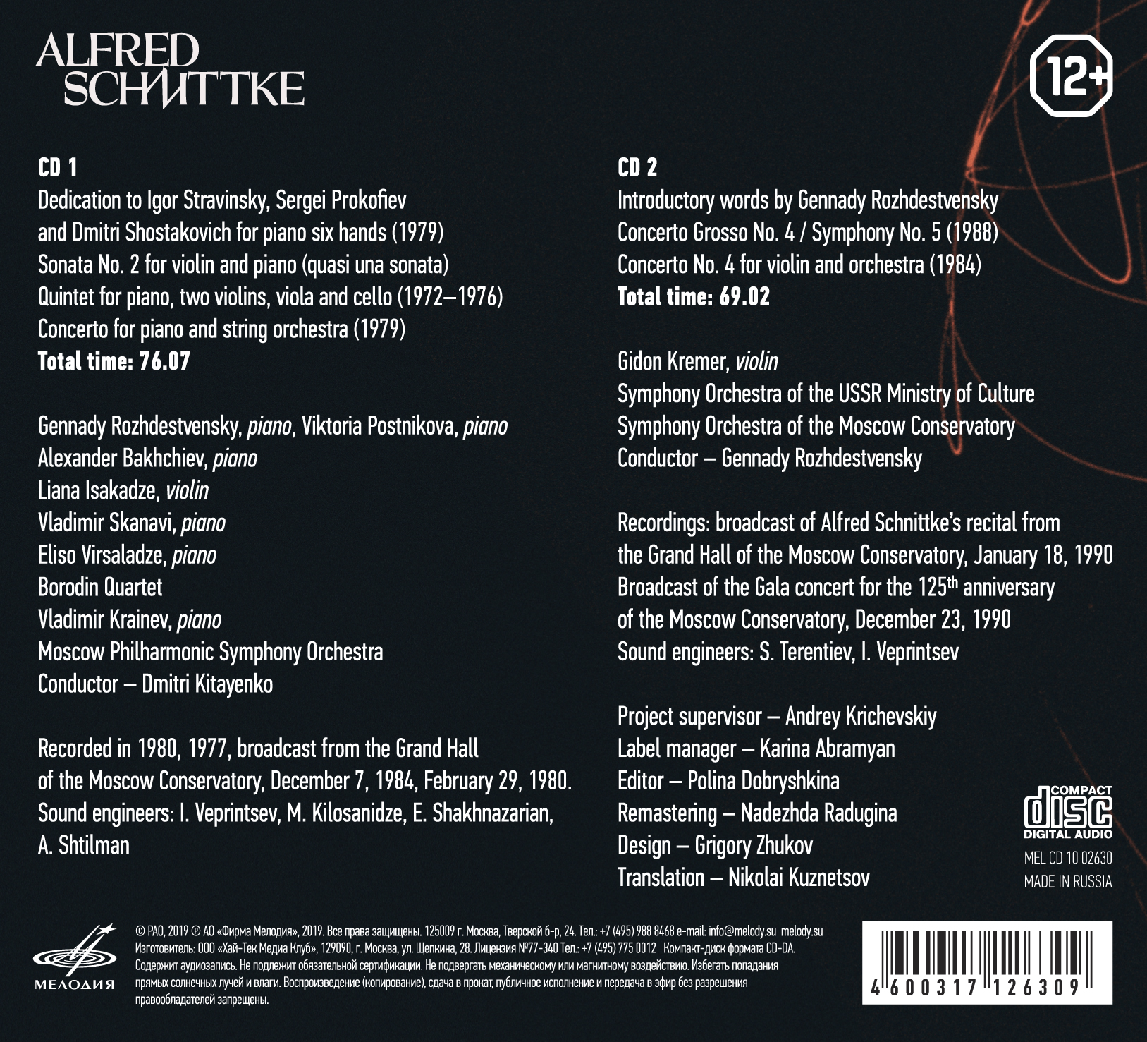 В сборнике представлены произведения Шнитке разных жанров. «Посвящение Прокофьеву, Шостаковичу и Стравинскому» для фортепиано в шесть рук, Вторая соната для скрипки, фортепианный и скрипичный концерты, Симфония № 5 звучат в исполнении выдающихся музыкантов: Геннадия Рождественского, Виктории Постниковой, Александра Бахчиева, Лианы Исакадзе, Владимира Сканави, Элисо Вирсаладзе, Квартета имени Бородина, Владимира Крайнева, Гидона Кремера, Дмитрия Китаенко, симфонических оркестров Министерства культуры, Московской консерватории, Московской государственной филармонии.