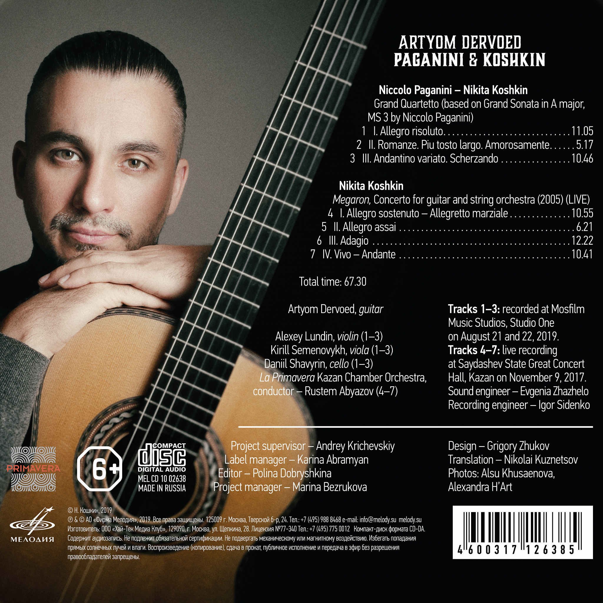 Альбом объединяет четырехчастный концерт для гитары и струнного оркестра «Мегарон» Никиты Кошкина и Большую сонату Никколо Паганини в транскрипции Н. Кошкина для квартета. «Паганини и Кошкин» — второй диск музыканта на «Фирме Мелодия» (первый вышел в 2015 году и посвящен испанской музыке), который отражает многолетнее сотрудничество Артёма Дервоеда и композитора Никиты Кошкина.