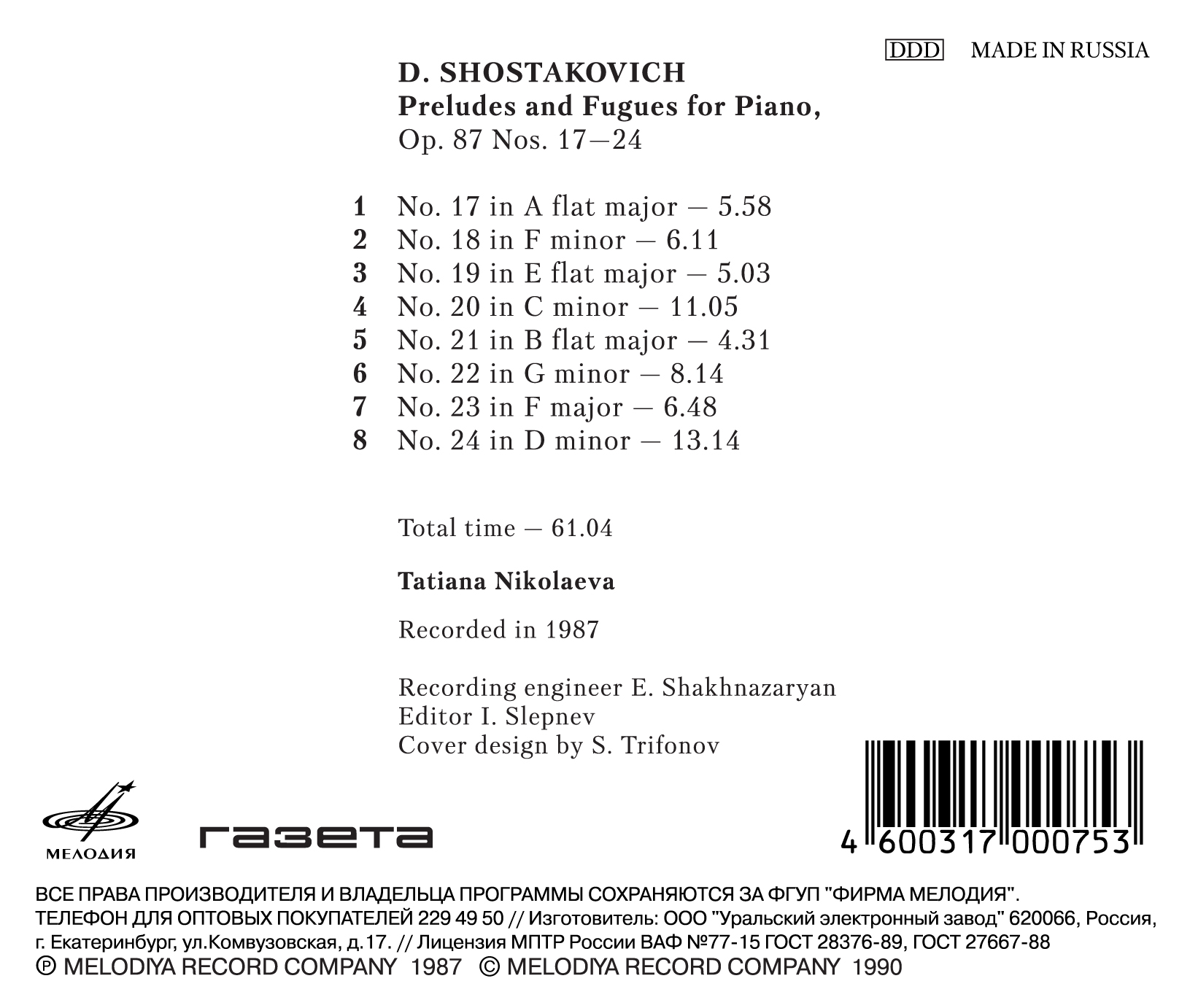 Прелюдии и фуги, соч. 87 по праву заняли теперь свое достойнейшее место в жизни. Они стали классикой. Я очень горда тем, что была первым интерпретатором цикла, что исполняю его целиком в два вечера, как и было задумано автором.