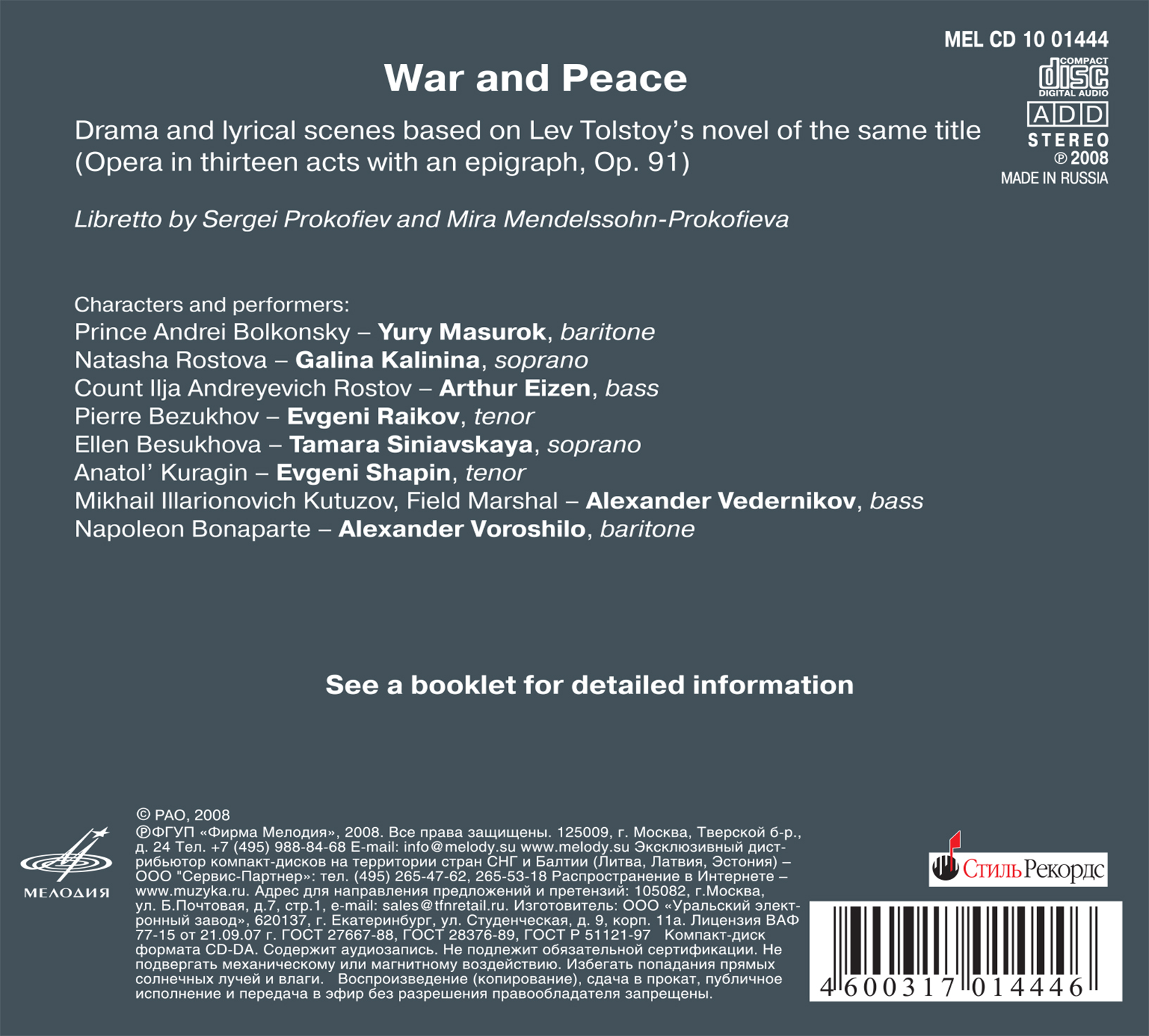 Как последнее сочинение Прокофьева в оперном жанре, «Война и мир» объединяет в себе лучшие черты музыкального дарования композитора. «Я уверен в том, что «Война и мир» — это «Евгений Онегин» наших дней», — писал автору Александр Гаук после блестящей премьеры. Слушатели подтвердят истинность этих слов.