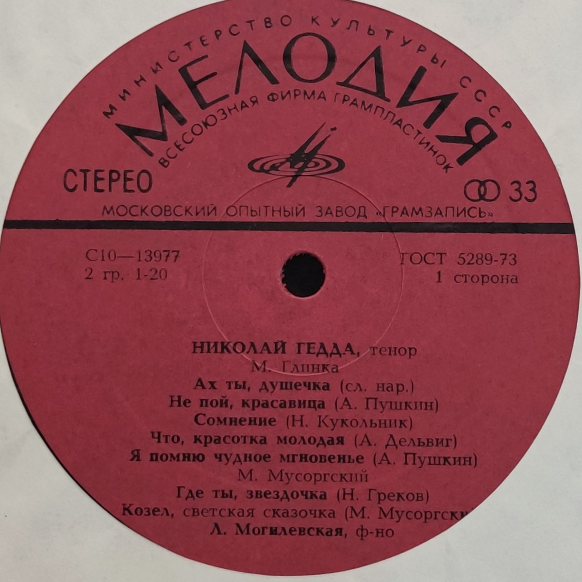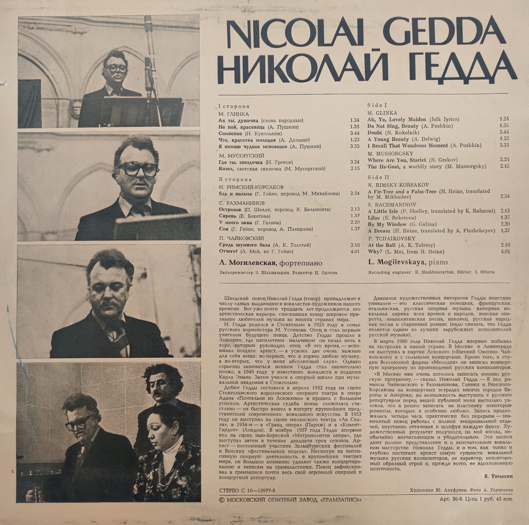 Пластинка 1980 года представляет вокальное творчество выдающегося шведского певца Николая Гедды. Его репертуар был обширным. Он исполнял классическую немецкую, итальянскую, французскую, русскую оперную музыку, народную музыку, а также старинные романсы. Николая Гедду называли лучшим зарубежным исполнителем русской музыки. Впервые он посетил нашу страну в марте 1980 года, тогда же и была сделана данная запись, где представлены одни из любимых романсов исполнителя.