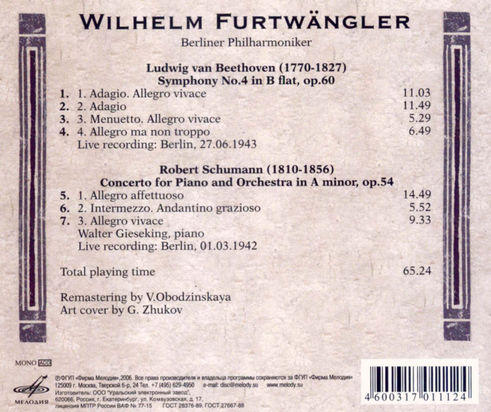 Вильгельм Фуртвенглер - Людвиг ван Бетховен: Симфония № 4 - Роберт Шуман: Концерт для фортепиано и оркестра, соч. 54 (Live)