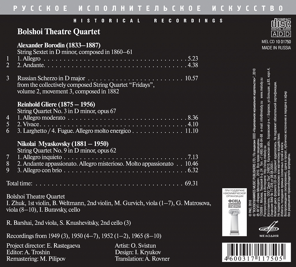 Очередной диск из серии «Легенды XX века. Русское исполнительское искусство» дает представление о коллективе, возникшем в 1931 году и включавшем в себя музыкантов оркестра ГАБТ СССР. Ансамбль просуществовал до 1968 года. За этот период состав видоизменялся. Среди участников Квартета были такие выдающиеся представители российского исполнительства, как: Исаак Жук, Борис Вельтман, Святослав Кнушевицкий. Программа диска составлена таким образом, чтобы дать представление обо всех периодах творчества Квартета Большого театра.