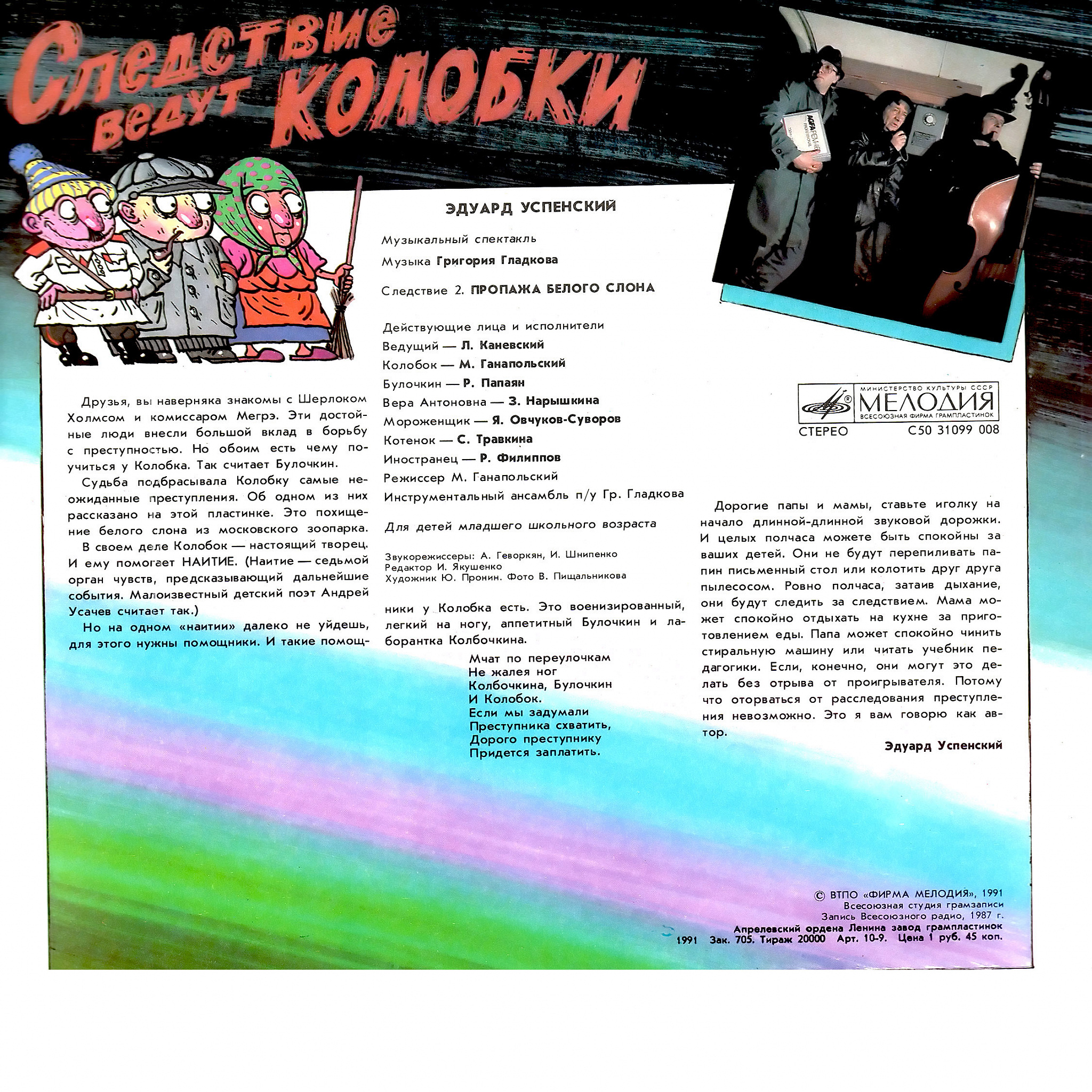 Друзья, вы наверняка знакомы с Шерлоком Холмсом и комиссаром Мегрэ. Эти достойные люди внесли большой вклад в борьбу с преступностью. Но обоим есть чему поучиться у Колобка. Как считает Булочкин. Судьба подбрасывала Колобку самые неожиданные преступления. Об одном из них рассказано на этой пластинке. Это похищение белого слона из московского зоопарка.