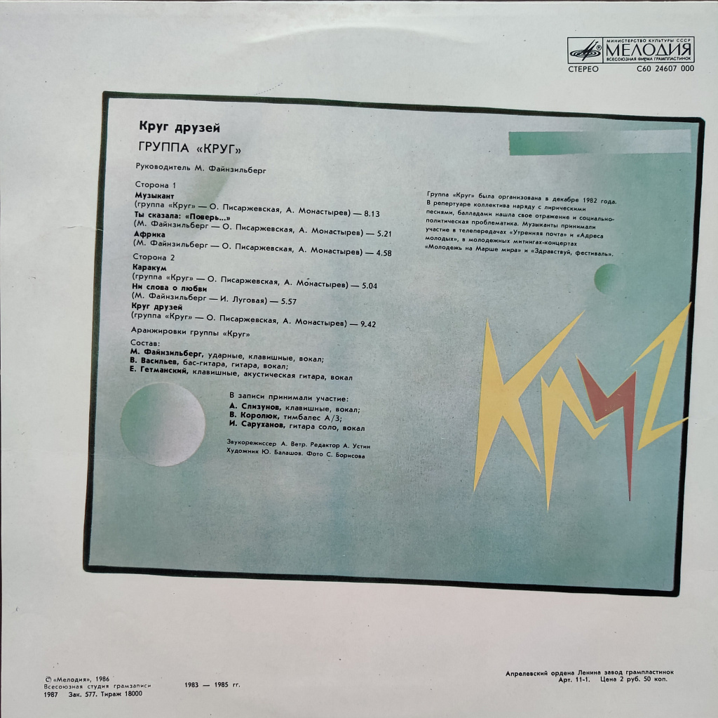 Пластинка, вышедшая в 1986 году представляет альбом “ Круг друзей”, куда вошли песни разных лет, в том числе песня “Каракум”, которая стала визитной карточкой коллектива. Группа «Круг» была организована в декабре 1982 года. В репертуаре коллектива наряду с лирическими песнями, балладами нашла свое отражение и социально-политическая проблематика. Музыканты принимали участие в телепередачах «Утренняя почта» и «Адреса молодых», в молодежных митингах-концертах «Молодежь на Марше мира» и «Здравствуй, фестиваль».