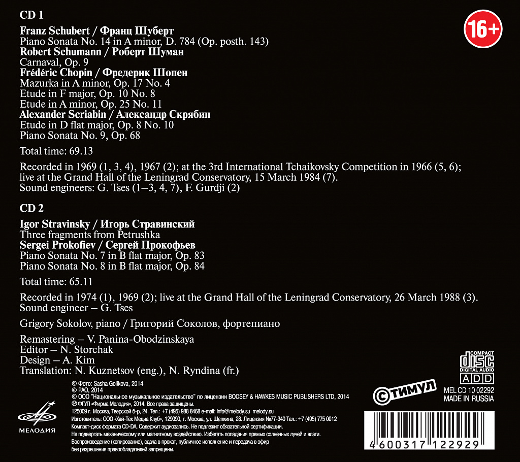 The recordings featured on two discs were made in Leningrad in the late 1960s to the 1980s. The pianist's early recording are of special interest – Schumann's brilliant, ringing Carnaval, Chopin's moving piano miniatures, and Schubert and Scriabin's sonatas. The second disc includes a virtuosic transcription of three fragments from Stravinsky's Petrushka and two of Prokofiev's “war” sonatas (Nos 7 and 8). At one time, these sonatas were premiered by Sviatoslav Richter and Emil Gilels, the great pianists of the 20th century. Grigory Sokolov is by right referred to as an heir to their performing art.