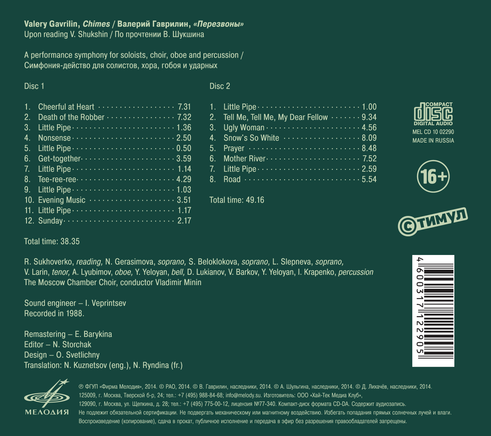 Firma Melodiya presents one of the brightest masterpieces of Russian choral music of the 20th century – Valery Gavrilin’s Chimes. This composer is by right named Georgy Sviridov’s successor. The major motifs of Valery Gavrilin’s music are associated with folklore, images of the Russian north and native region of Vologda. Chimes, a “performance symphony” as the composer defined the genre of the piece, was written for soloists, choir, oboe and percussion, and subtitled “upon reading V. Shukshin”. The roots of his art go deep into the native land”, Gavrilin commented on the works of Vasily Shukshin, an outstanding Russian writer, actor and film director, a singer of the Russian provinces. The key image of the piece was borrowed from one of Shukshin’s novels – a “noble robber” (Stepan Razin, a Cossack leader of the Russian peasant revolt of the 17th century). The text was compiled of folklore sources and Vladimir Monomakh’s Instructions, a Russian literary monument of the 12th century. Chimes was premiered in Leningrad and Moscow in 1984. The work which received a State Prize of the USSR won recognition of a broad audience. “It is written with blood of the heart. Living, contemporary music of a deeply national stamp, and above all, of a present-day world-view born here, in our land”, Georgy Sviridov commented on the work. Chimes was composed for the Moscow Chamber Choir which was founded by the prominent choral conductor Vladimir Minin in 1972 and is still one of the best choirs of Russia has successfully represented traditions of Russian choral signing in this country and abroad. The recording of Valery Gavrilin’s Chimes performed by the Moscow Chamber Choir with the participation of Rogvold Sukhoverko, a renowned actor of Sovremennik Theatre, Anatoly Lyubimov, an oboist and soloist of the State Academic Symphony Orchestra, and other musicians led by Vladimir Minin was made in 1988.