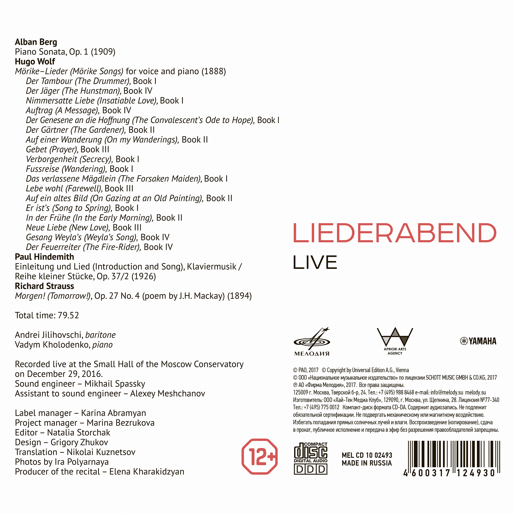 The works by Wolf, Strauss, Berg and Hindemith are performed by Andrei Jilihovschi, a soloist of the Bolshoi Theatre of Russia, and Vadym Kholodenko, one of the most promising pianists of the new generation and winner of the Triumph Youth Prize and prizes of the Van Cliburn, Franz Schubert, Gina Bachauer and Franz Liszt competitions.