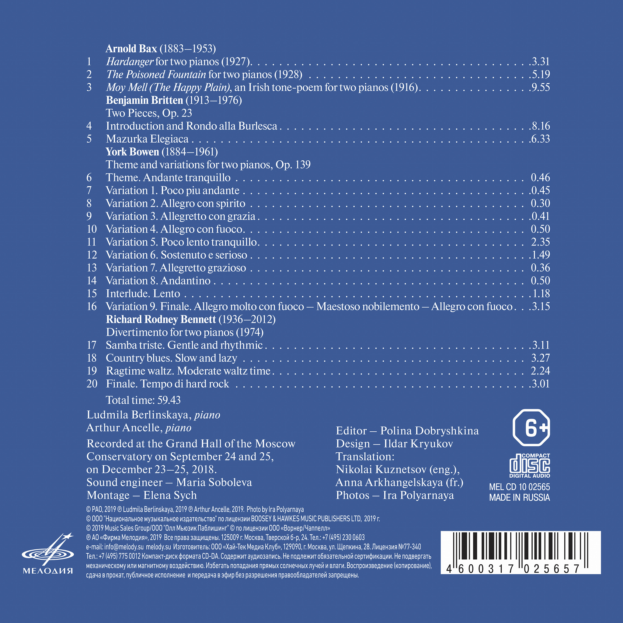 This album recorded by the piano duo of Ludmila Berlinskaya and Arthur Ancelle on the Melodiya is dedicated to English music of the 20th century.
