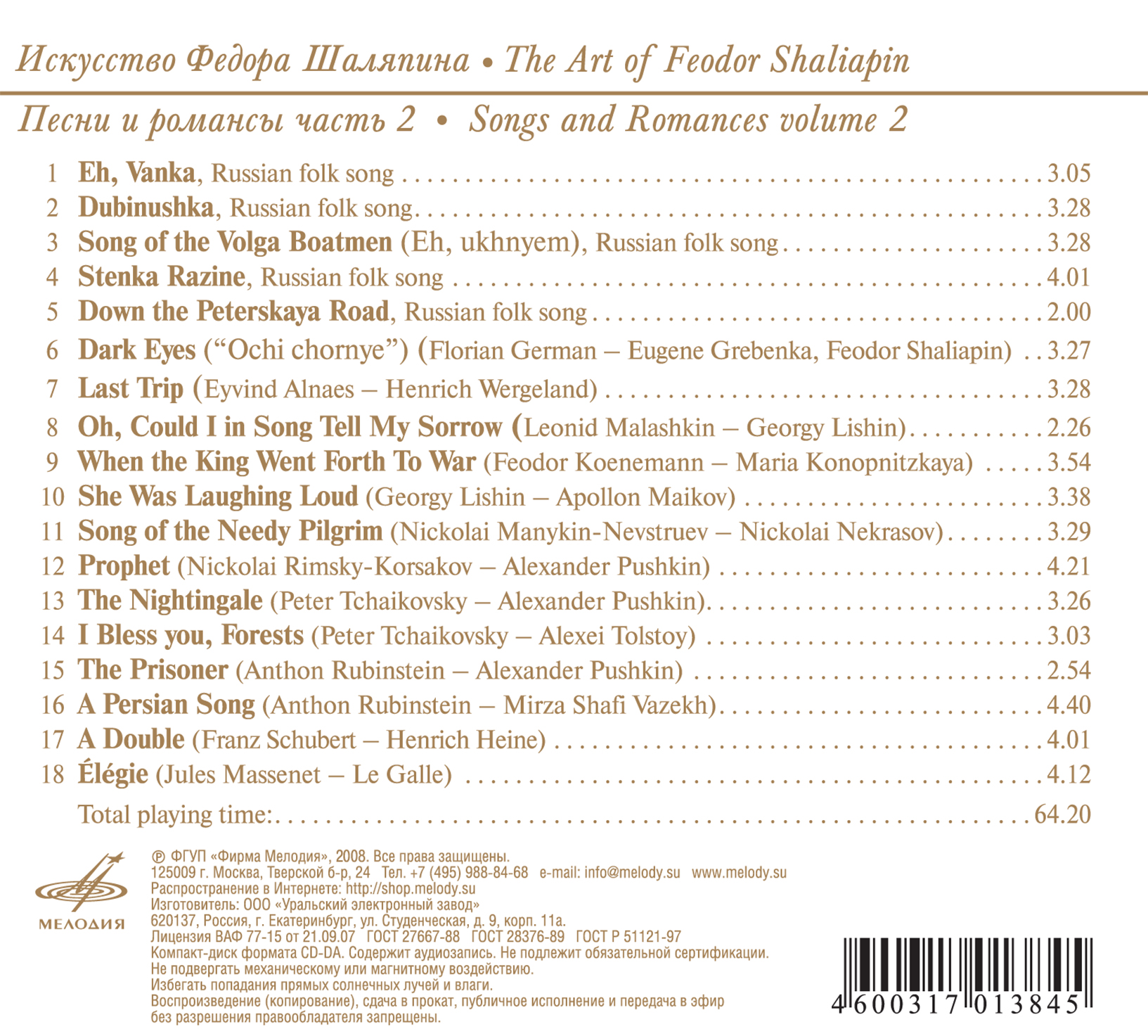 Shaliapin’s performance is beyond any imitation; it is even more difficult to imagine that somebody else could interpret those pieces in a different way. His mastery that was perfected by constant work of thought is convincing. “When I am singing the personified image is always in front of me. It is right in front of my eyes. I am singing and listening, acting and watching. I am never alone on the stage… There are two Shaliapins on the stage” (F.Shaliapin “Mask and Soul”).